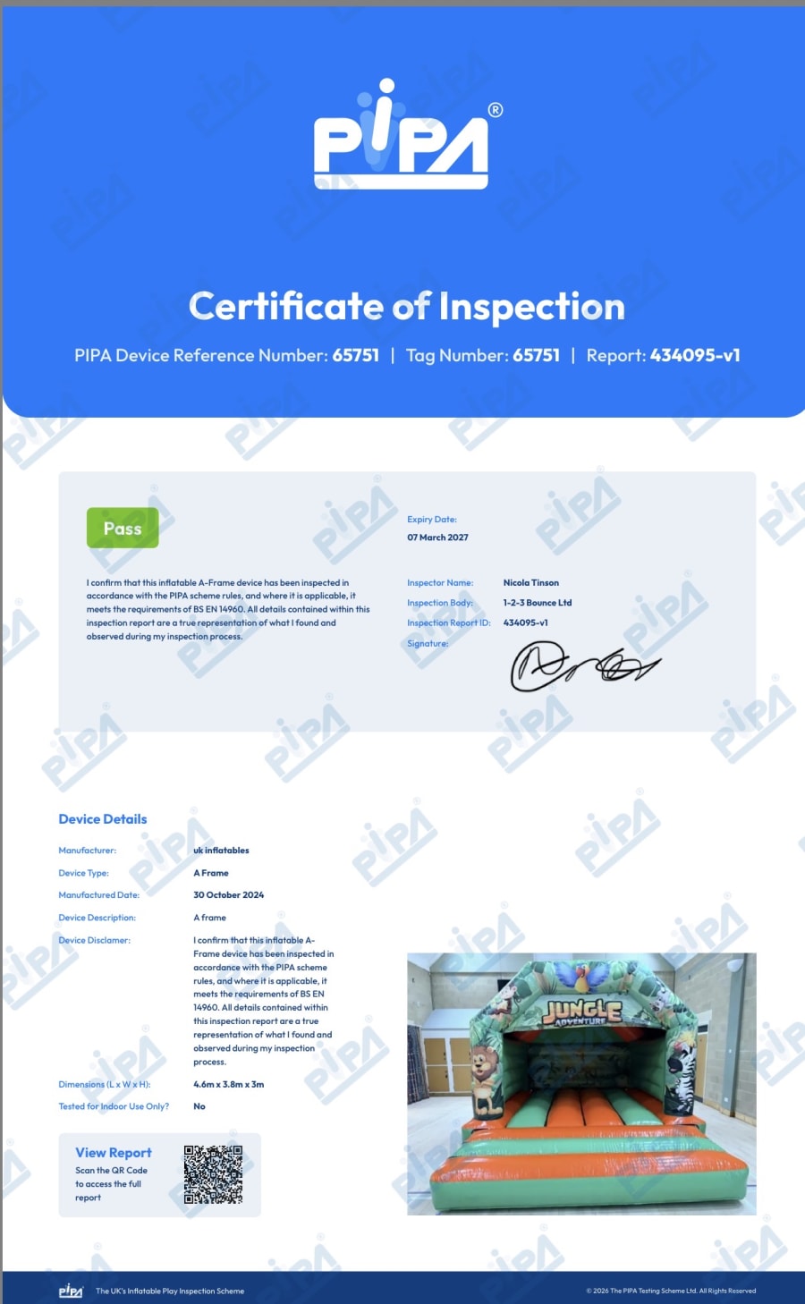 The inflatable will be professionally set up by a qualified and uniformed member from 1-2-3 Bounce Ltd.