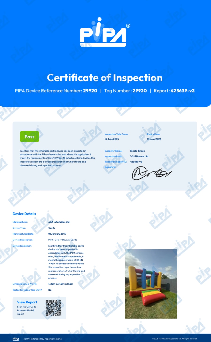 The inflatable will be professionally set up by a qualified and uniformed member from 1-2-3 Bounce Ltd.